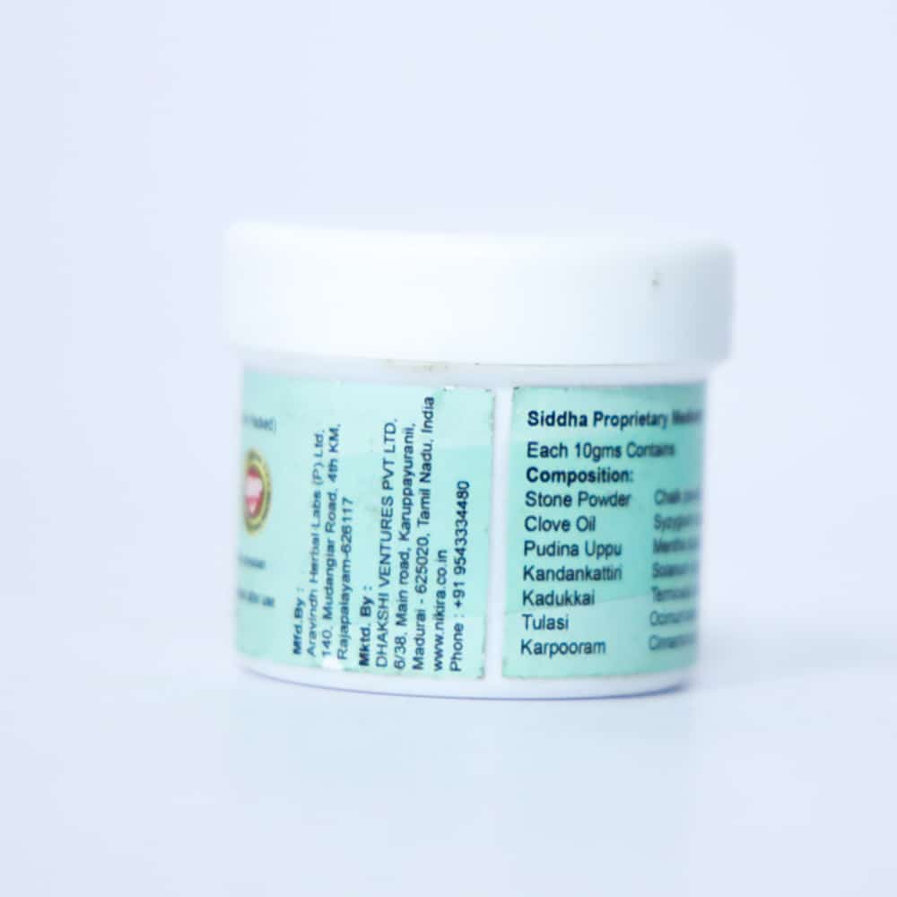 • SIDDHA PROPRIETARY MEDICINE :The Herbal based blend is made using naturally occurring ingredients like Neem, Kadukkai, Ginger, Pepper and Clove Oil.